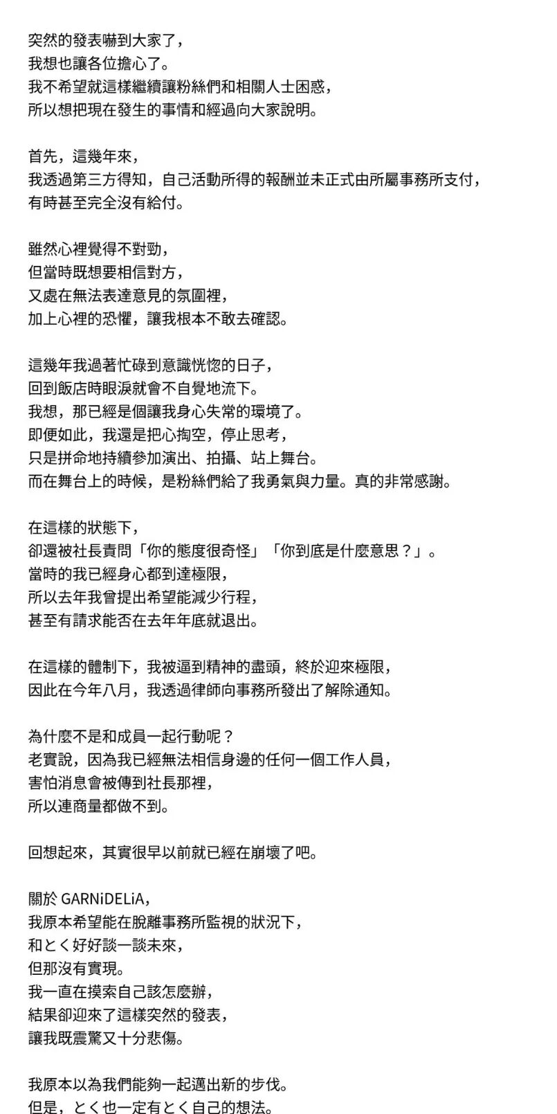 她解釋,之所以沒有與toku一起行動,是原本希望在事務所無法監控的環境下,與搭檔一起討論未來,但此事遲遲未能如意,就在自己還在摸索出路的時候,組合突然被宣佈無限期休眠,這令她“既震驚又悲傷”。