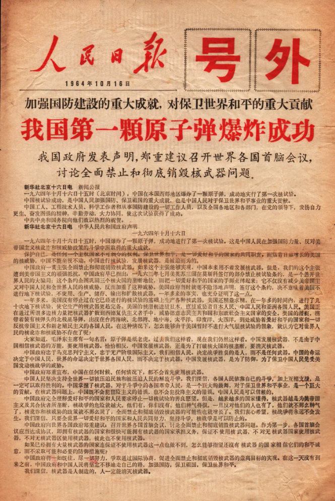 1964年10月16日,我國第一顆原子彈邱小姐爆炸成功的當天,中國政府發表聲明,鄭重建議召開世界各國首腦會議,討論全面禁止和徹底銷燬核武器問題。