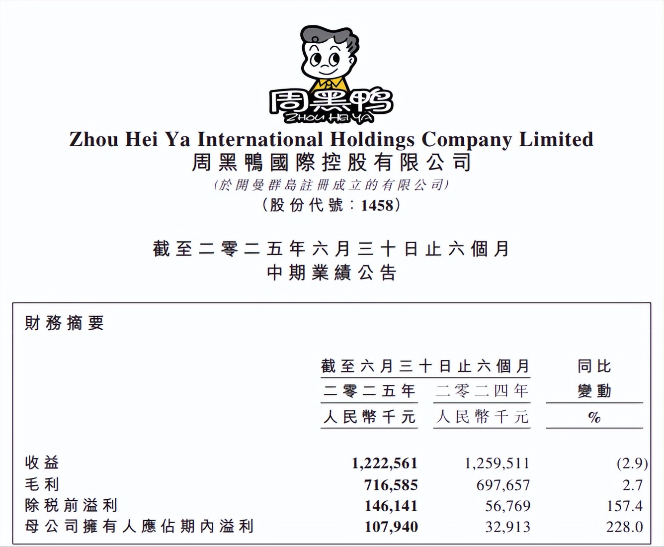 近日,周黑鴨(01458.HK)發佈2025年上半年業績報告。報告期內,公司實現營收12.23億元,同比減少2.93%;實現淨利潤1.08億元,同比增長228%。