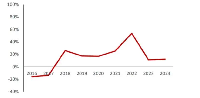 從2018年開始,中國化工行業開始了一輪轟轟烈烈的產能大擴張。從在建工程投資總額看,2018年到2024年年均保持正增長。2024年更是達到了3884億元,同比增長12.3%,但比2022年的50%以上要慢一些了。2025年一季度則自2018年以來首次落入了負數區間。
