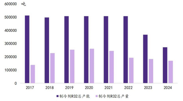 這在化工業或其他工業領域都有過典型案例。2022年之後,製冷劑(氟化工產業鏈關鍵產品)開始實施配額制,開工率與總產量持續下降。供給端大幅壓減,而需求端還有一定增量,導致製冷劑價格持續上漲,行業利潤持續回升。
