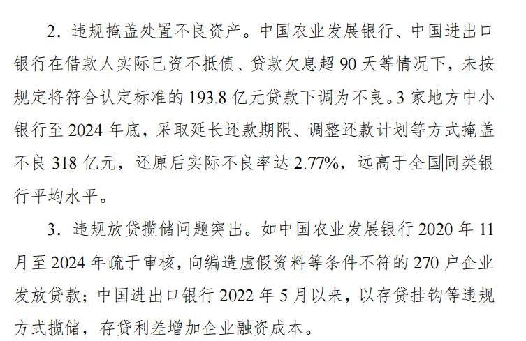 以及如中國農業發展銀行2020年11月至2024年疏於審核,向編造虛假資料等條件不符的 270 户企業發放貸款;中國進出口銀行2022 年5月以來,以存貸掛鈎等違規方式攬儲,存貸利差增加企業融資成本。