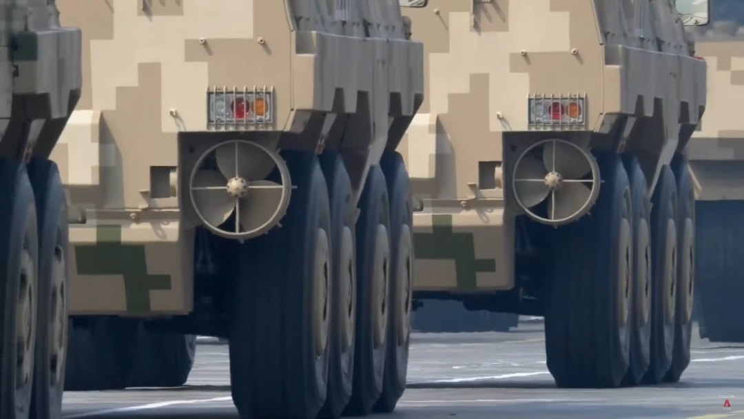 第二個要補充的是海軍陸戰隊的兩棲戰裝備,之前的ZBD-05型兩棲步戰車和ZTD-05型兩棲突擊車不見蹤影,取而代之的是看起來很常規的東西——H/ZBL-08型輪式步兵戰車和H/ZLT-11型輪式突擊車(輪式坦克)。