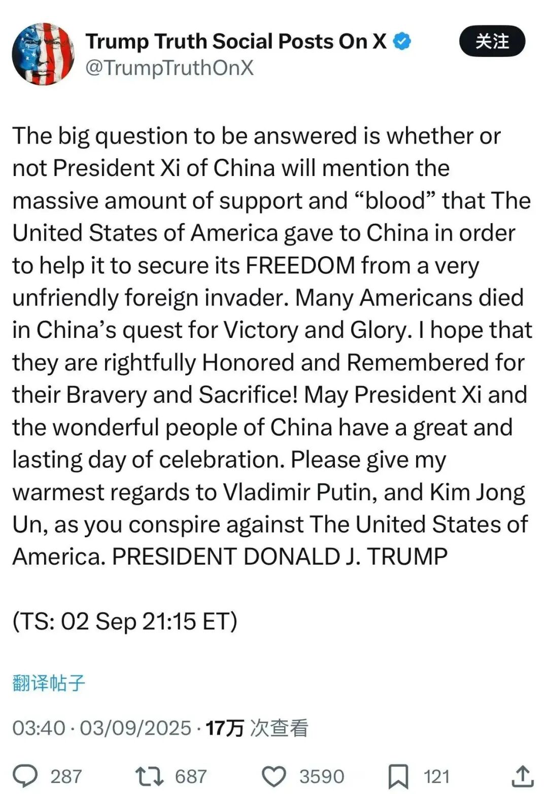 大概的意思就是我們也出力了,我們也有犧牲和貢獻!不能忘記我們!當然也恭喜閲兵成功,同時帶去我對那兩位的問候,你們肯定沒幹好事!