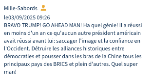 特朗普,你最棒!加油啊bro!真是個天才!不到一年時間,他就取得了前幾任美國總統都未曾做到的成就:摧毀了西方國家的形象和信任。摧毀了民主國家之間歷史性的聯盟,並將所有主要金磚國家以及其他許多國家推向了中國的懷抱。真是個超人!