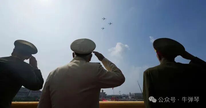 這是轟炸機梯隊飛過天安門廣場上空時嘉賓敬禮。新華社記者 才揚 攝