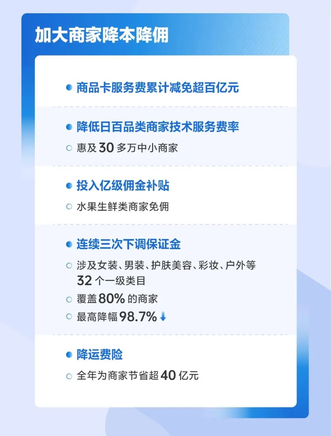 首先是啓動資金。《抖音電商2024平台服務體驗報告》(下簡稱“《報告》”)顯示,抖音降低了多類費用,比如商品卡服務費減免政策,就累計為商家減免費用超過百億元,中小商家的減免超過70億元。