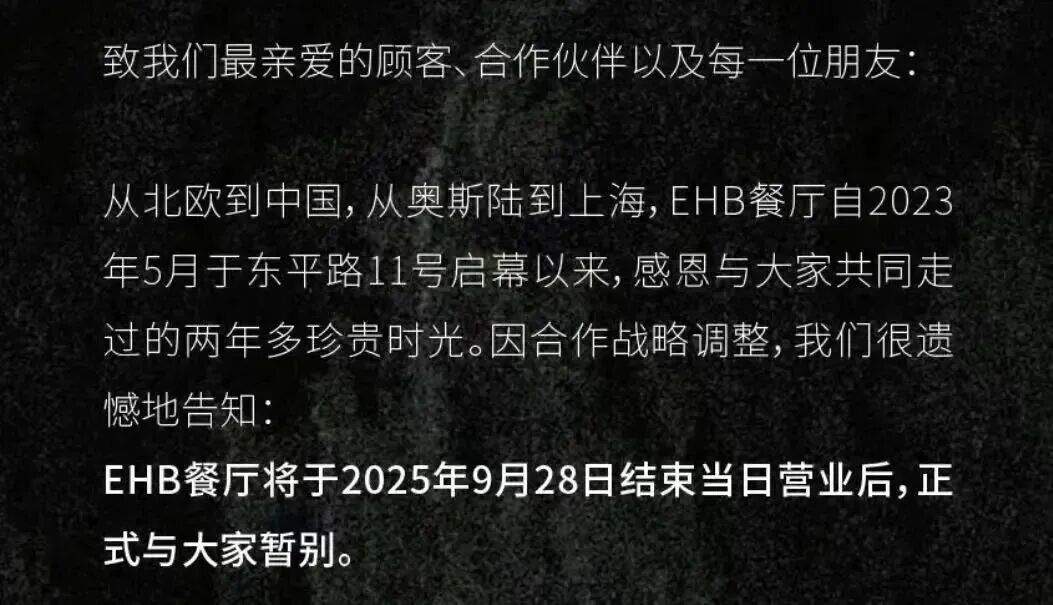 EHB餐廳在閉店公告中表示,此次“暫別並非終點”,未來期待以“全新形態”與大家再度相見。不過,截至發稿,官方尚未透露任何關於重啓計劃或經營策略調整的具體細節。