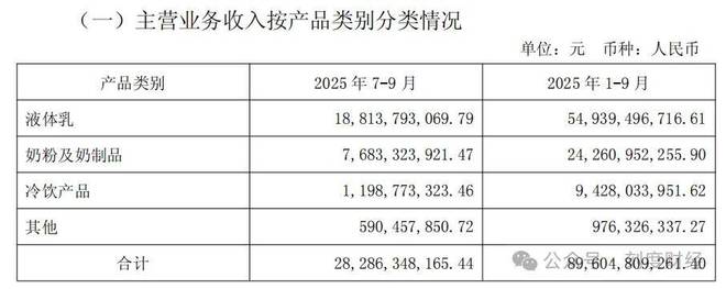 在投資業務“拖後腿”的同時,被視為“基本盤”的核心業務也顯現疲態。財報數據顯示,前三季度營收903.41億元的微增1.81%,實則是建立在奶粉、冷飲業務高增長與液體乳業務停滯的“結構性失衡”之上,且第三季度單季營收285.64億元同比下滑1.63%,成為今年以來首次單季營收負增長。