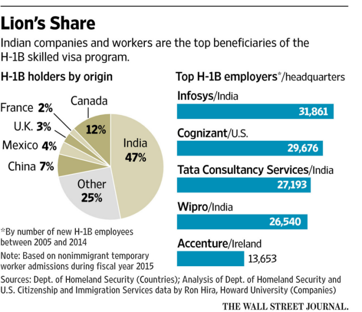 H-1B排名前幾名的僱傭者,很多都有印度背景(@華爾街日報)