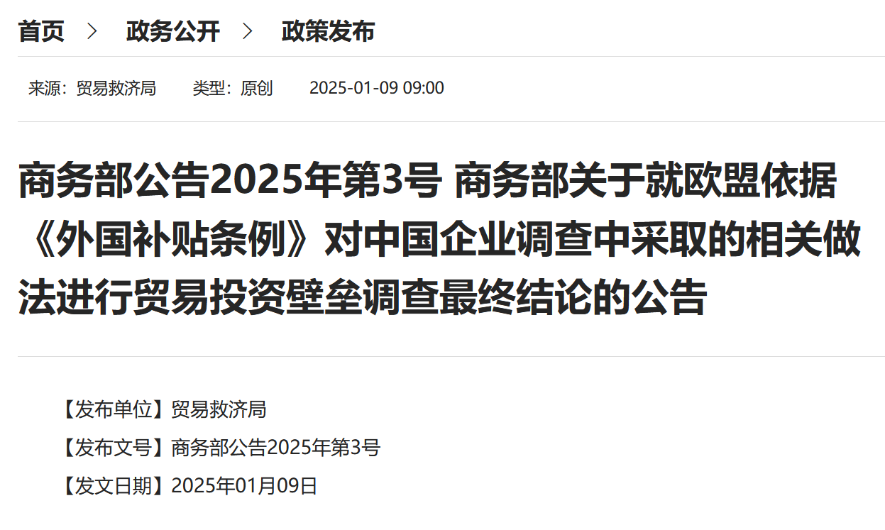 1月9日,商務部網站發佈關於就歐盟依據《外國補貼條例》對中國企業調查中採取的相關做法進行貿易投資壁壘調查最終結論的公告: