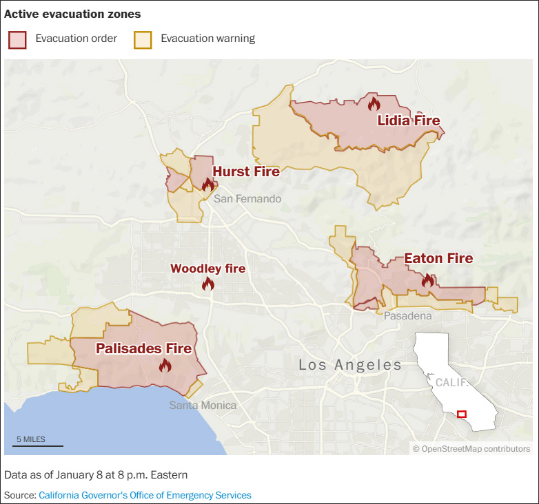 美國國家海洋和大氣管理局(NOAA)表示,今年冬季的“聖塔安娜風”比往年更為強勁,提高了山火威脅。天氣預報人員估計,洛杉磯縣相對濕度較低、風力強勁和乾燥的天氣狀況可能持續到當地時間1月10日,這意味着當地天氣依然有可能助長火勢。