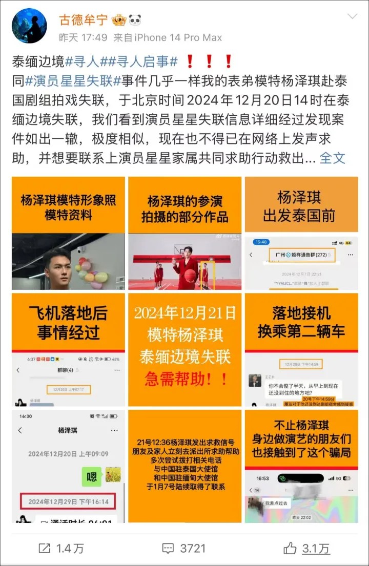 據紅星新聞報道,1月8日,00後模特楊澤琪的家人在社交平台求助,稱其於2024年12月20日在泰緬邊境失聯,與演員王星失聯經歷極度相似。“現在也不得已在網絡上發聲求助,並想要聯繫上演員星星家屬共同求助行動救出親友。”