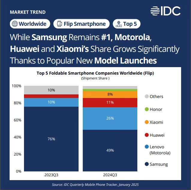 相比2023年三季度,全球摺疊屏市場格局有新變化。IDC表示,三星出貨量仍居首位(49%),摩托羅拉(26%)、華為(11%)和小米(8%)的份額因新機型受歡迎而顯著增長。