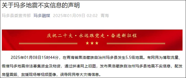 青海瑪多縣委員會宣傳部微信公眾號“瑪多融媒”1月9日發佈關於瑪多地震不實信息的聲明。