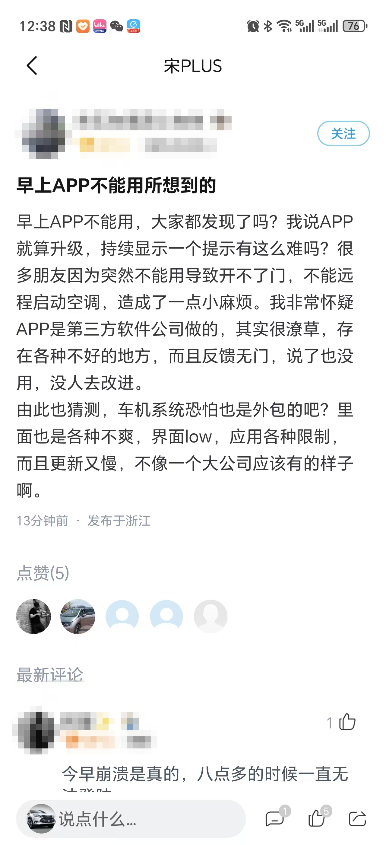 在比亞迪APP的社區內,也有不少車主吐槽APP升級沒有提示或者缺少持續提示,並有車主表示APP設計存在一些問題、更新緩慢,即使向上反饋也缺乏改進。