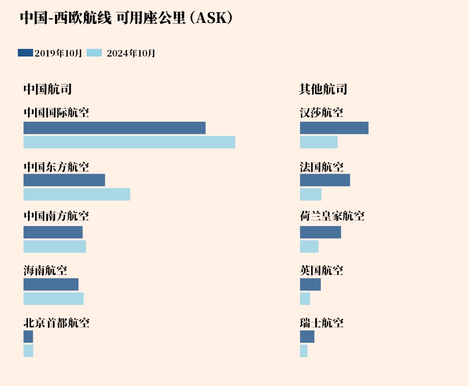 根據星展銀行股票研究分析師傑森·薩姆統計,2024年10月份中國三大航司(中國國際航空、中國東方航空和中國南方航空)往返中國和西歐之間的客運量(以可用座公里數衡量)比2019年同期高出了18%。