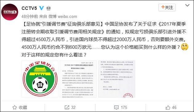 所謂“引援調節費”,是中國足球金元時代的產物。2017年5月開始,足協連續下發《限制高價引援的通知》《收取引援調節費用相關規定》等多道文件,明確規定對各俱樂部轉會費超過一定數額(外援4500萬元,內援2000萬元)的引援徵收調節費。僅廣州隊一家,當年為塔利斯卡和保利尼奧兩名外援就繳納了4億多元引援調節費。