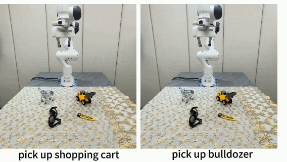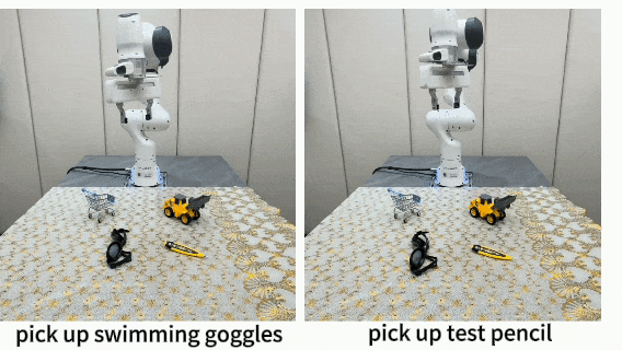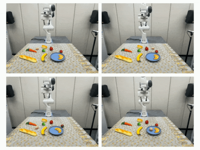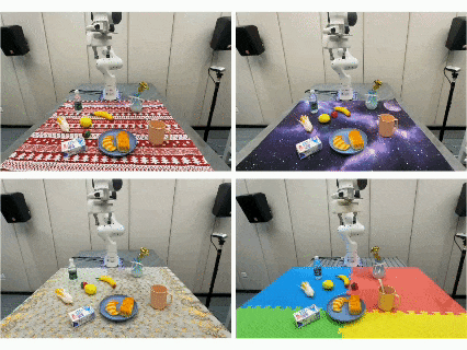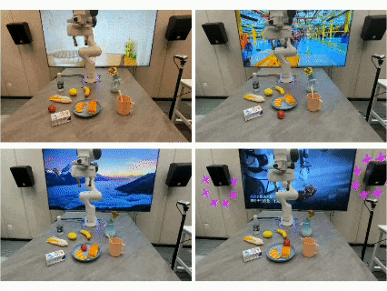 **背景泛化。**實際環境中,機器人工作場景不盡相同,模型需要面對不同材質、不同紋理的桌面和操作枱,甚至動態變化的背景畫面。
