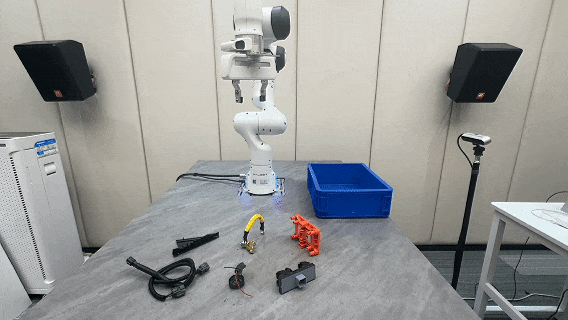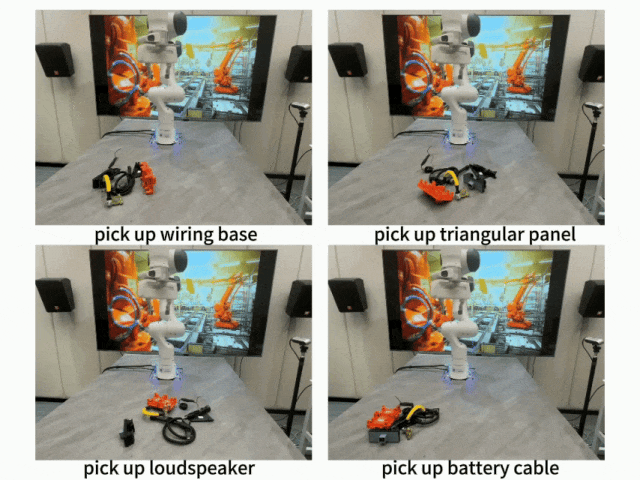工業場景中,往往有大量行業專用的特殊零件。雖然模型僅需預訓練就可以抓起任意零件,但難以直接根據語言指令抓起對應物體,比如指定“抓取車窗控制器”,但模型抓起了接線座。