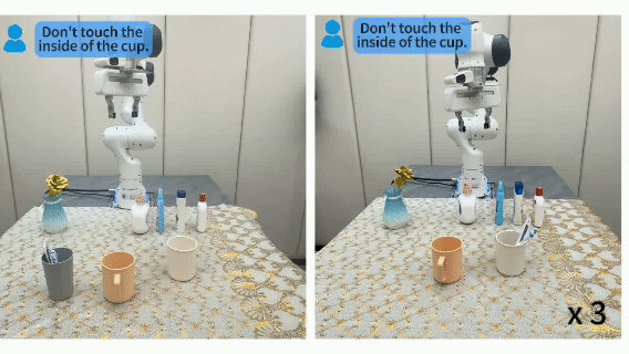 在家庭場景中,人們對機器人的行為會有特定的偏好,例如抓取杯子時不要碰到杯子內壁。同樣通過採集少量帶偏好的抓取軌跡,GraspVLA 即可學會按照自然語義抓取。
