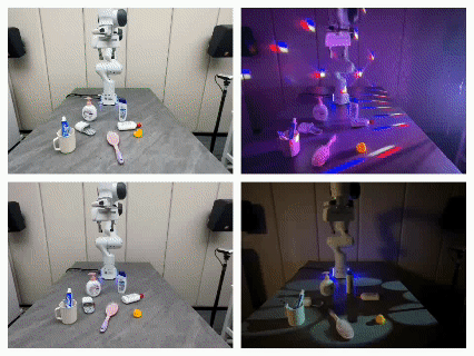 **光照泛化。**咖啡廳、便利店、生產車間、KTV 等不同光照條件下,光線的冷暖、強弱變化,包括漸變和驟變,以及在極端黑暗環境下移動目標物體時,模型都應該具備準確找到並正常抓取物體的能力。