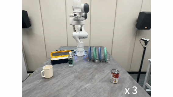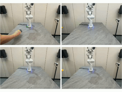 **動態干擾泛化。**真實工作場景複雜多變,機器人在執行任務時常常會受到干擾。在工作過程中,即使往工作空間中隨意添加干擾物體,甚至發生撞擊並使目標物體隨機移位,模型也需要可以穩定地完成任務。