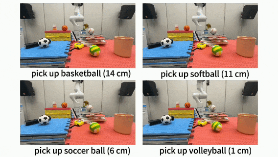 **空間高度泛化。**即使面對物體擺放高低錯落的工作台,模型也應該可以從容抓取。