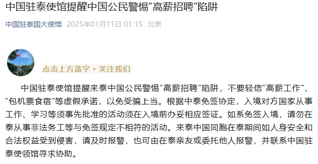 據中國駐泰國大使館微信公眾號1月11日消息,中國駐泰使館提醒來泰中國公民警惕“高薪招聘”陷阱,不要輕信“高薪工作”、“包機票食宿”等虛假承諾,以免受騙上當。