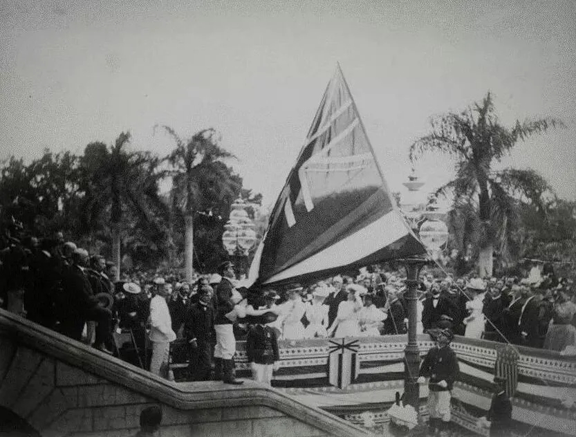 王宮門前降下夏威夷國旗
