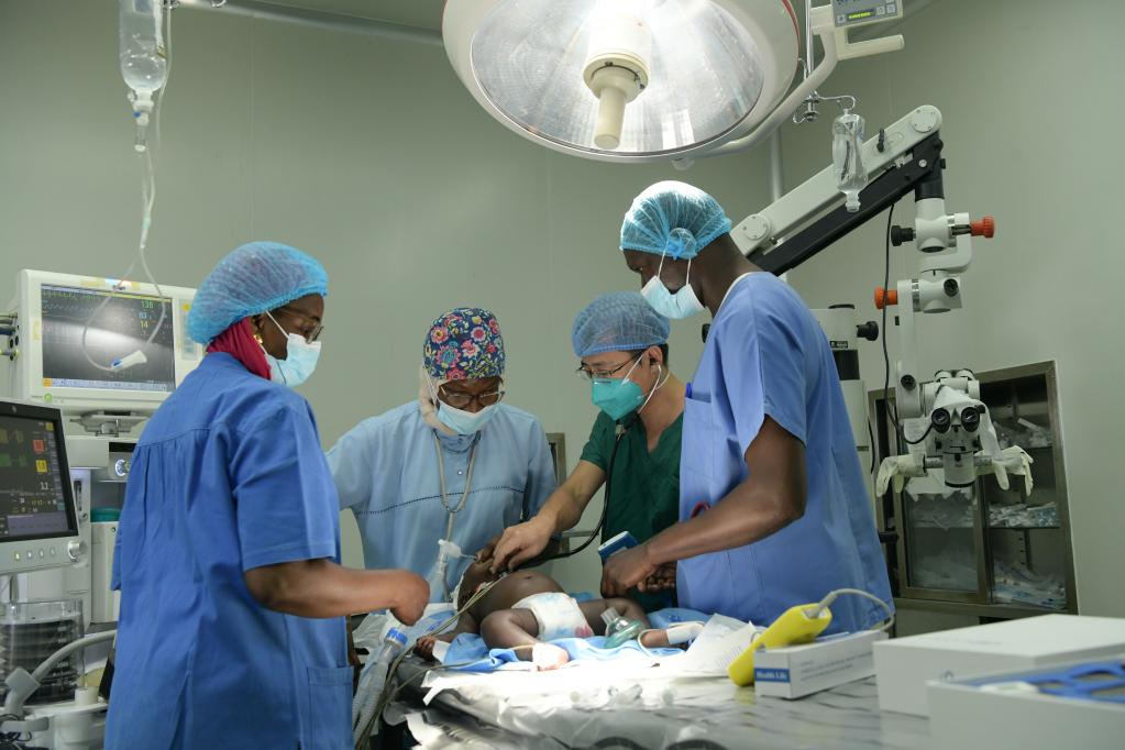 在塞內加爾迪亞姆尼亞久兒童醫院,中國第19批援塞內加爾醫療隊麻醉科醫生黃建斌(右二)為手術患兒進行麻醉監測。 圖源:新華社