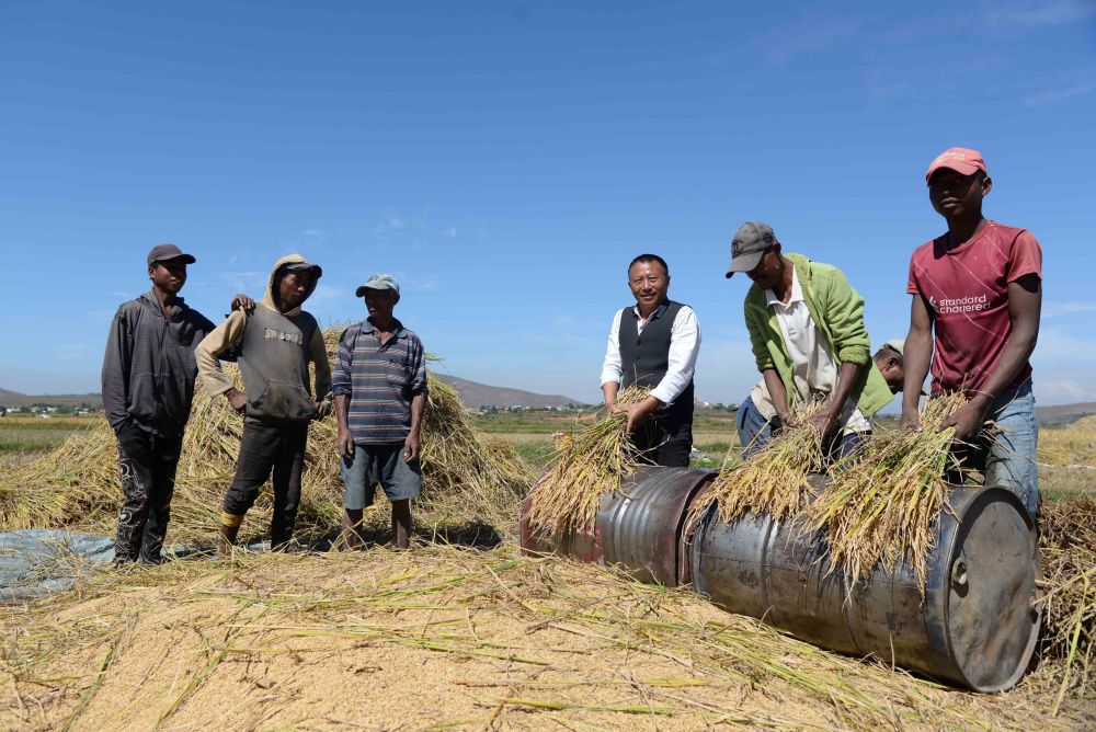在馬達加斯加首都塔那那利佛附近的馬義奇鎮,中國雜交水稻技術專家胡月舫(右三)在中國國家雜交水稻工程技術研究中心非洲分中心的試驗田裏和當地農民一起收穫水稻。 圖源:新華社