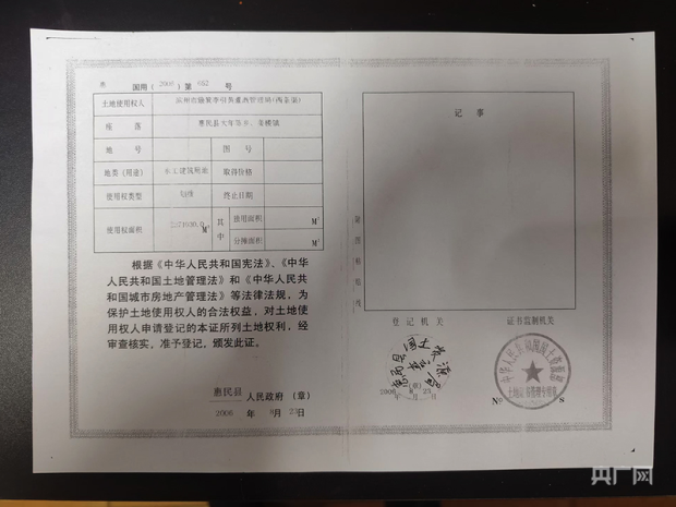 然而,在走訪惠民縣自然資源和規劃局時,記者卻得到了截然不同的説法。工作人員聲稱,涉事的土地在多年前就已經辦理了《國有土地使用證》,其地類用途為“水工建築用地”,因此可以進行挖土作業。究竟是“破壞耕地”還是“合理挖土”?一塊土地如何出現兩種截然不同的用途?