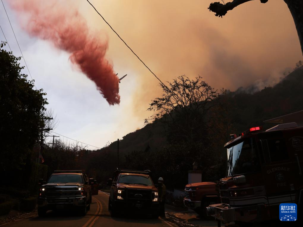 1月11日,一架消防飛機在美國加利福尼亞州洛杉磯曼德維爾峽谷的山丘上投放阻燃劑,以防止野火進一步蔓延。 新華社