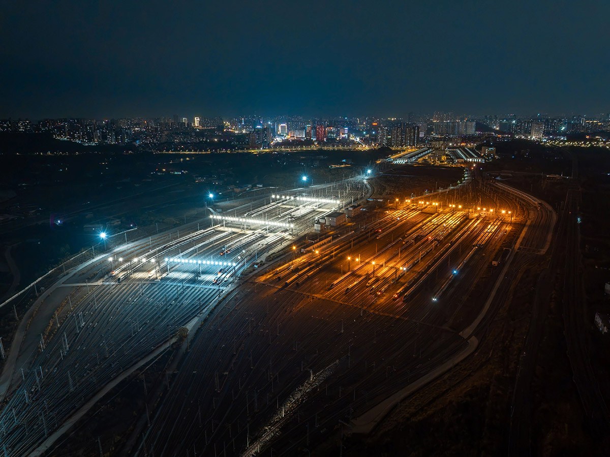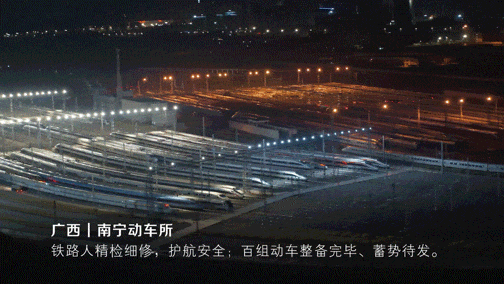廣西南寧動車所燈火通明、熱火朝天,機械師精檢細修,保障安全,百組動車整備完畢、蓄勢待發。