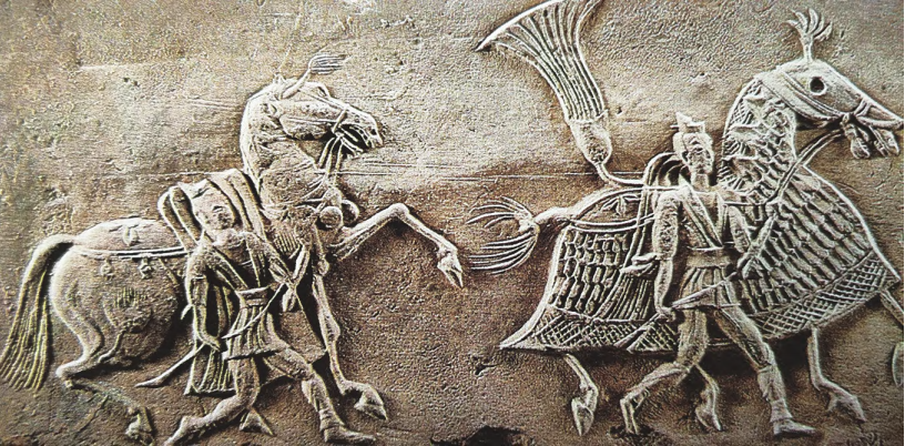 亞述是較早發展騎兵的古代文明。公元前9世紀,亞述騎士普遍裸騎光背馬,後在馬背上鋪獸皮或特製長方形軟墊。伊拉克尼尼微的亞述宮殿遺址浮雕,展現了公元前7世紀亞述王騎馬獵獅場景,此時騎兵戰鬥方式主要為騎射、短矛扎刺和投擲,還會配合盾與劍。