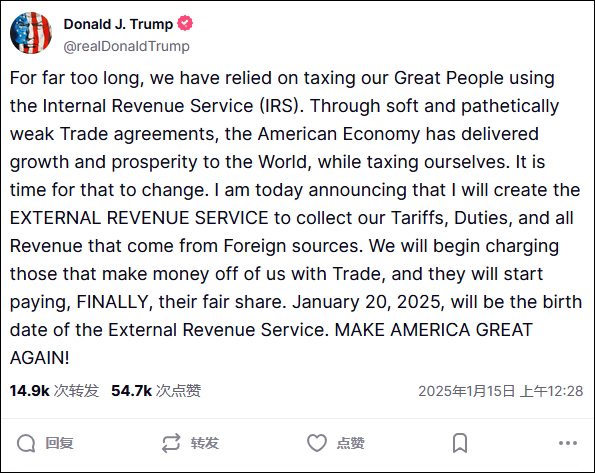 “今天,我宣佈將成立ERS,負責徵收關税(tariffs)、進口税(duties)以及所有外國來源收入。”他14日在其自創社交平台Truth Social上寫道,“我們將開始向那些從我們身上賺錢的人收取貿易費用,而他們也將最終開始支付他們應得的份額。2025年1月20日,將是ERS的誕生日。”