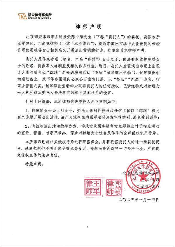 1月14日,著名作家瓊瑤的兒子陳中維委託@韜安律師事務所 針對未經許可使用瓊瑤相關名義開展演出營銷活動的行為發佈律師聲明。