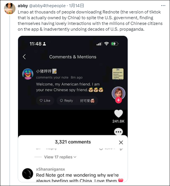 在社交媒體X平台上,一位名叫abby的用户發帖評論稱:“笑死我了(LMAO,類似中國的XSWL),成千上萬的(美國)人為了對抗美國政府而下載了小紅書,結果發現自己在這個應用程序上與數百萬中國人進行了愉快的互動,無意間讓美國數十年(對華不友好)的宣傳破功。”