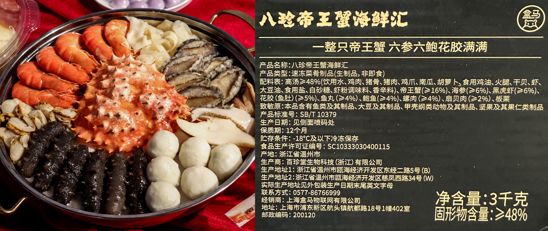 今年,盒馬把這道胡椒豬肚雞採用的原湯急凍工藝用在了更多年菜新品上,例如今年的八珍帝王蟹海鮮匯、奶白魚頭湯等。為了讓大家能看懂這些大菜的配料表,盒馬的研發採購們在菜品研發階段就要儘可能減少額外添加,連調味品的選擇也十分慎重。