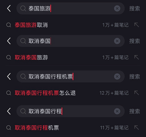 10日晚,小紅書上與“泰國旅遊”有關的部分搜索結果 社交媒體截圖
