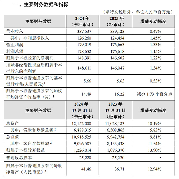 招商銀行公告顯示,2024年,該集團各項業務穩健開展,總體經營情況良好。利潤總額1786.52億元,同比增加20.34億元,增幅1.15%;歸屬於該行股東的淨利潤1483.91億元,同比增加17.89億元,增幅1.22%。