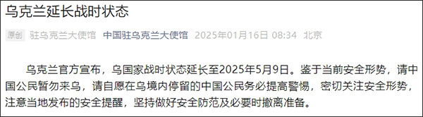 據微信公眾號“中國駐烏克蘭大使館”1月16日消息,烏克蘭官方宣佈,烏國家戰時狀態延長至2025年5月9日。鑑於當前安全形勢,請中國公民暫勿來烏,請自願在烏境內停留的中國公民務必提高警惕,密切關注安全形勢,注意當地發佈的安全提醒,堅持做好安全防範及必要時撤離準備。