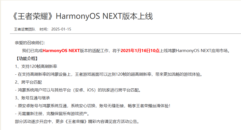 1月16日,國民級手遊《王者榮耀》鴻蒙正式版本宣佈上架應用市場及遊戲中心。據介紹,基於HarmonyOS NEXT方舟引擎支持,《王者榮耀》鴻蒙版能帶來原生流暢遊戲體驗,並支持120幀超高刷新率。