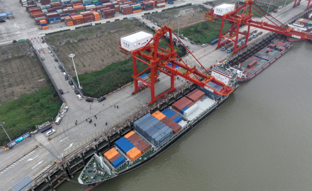 長江黃金水道鏈接海上絲綢之路。自2019年11月開通首條國際航線,到2024年底,武漢陽邏港共開通5條國際直達航線,年出入境船舶首次突破100艘。
