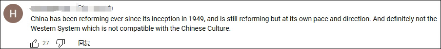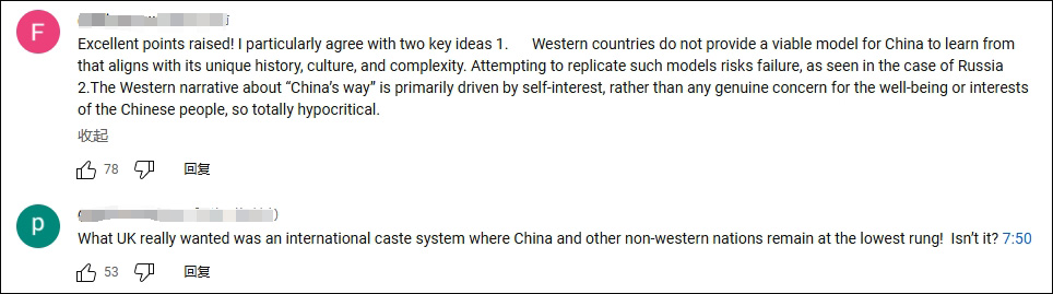 “很好的觀點!我特別同意兩個關鍵觀點:其一,西方國家沒有提供符合中國獨特歷史、文化和複雜性的可行模式。試圖複製此類模式可能會失敗,正如俄羅斯的例子;其二,西方關於‘中國道路’的敍述主要是出於自身利益,而不是真正關心中國人民的福祉或利益,太虛偽了。”
