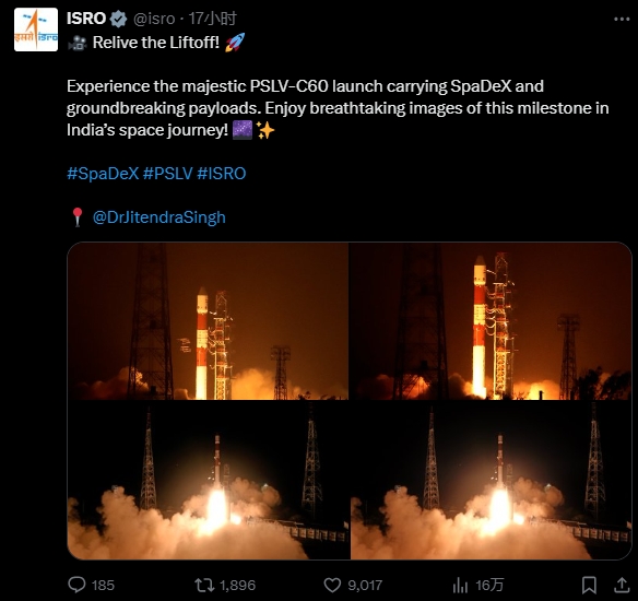 去年12月30日,印度發射衞星,執行印度首次太空對接測試飛行任務 推文截圖