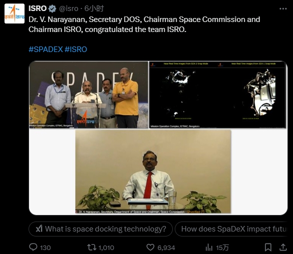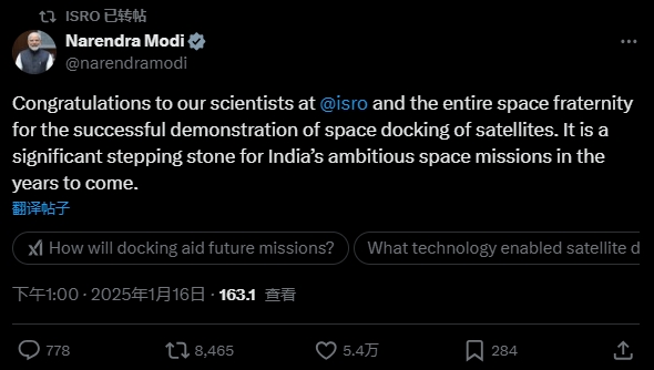印度總理莫迪在X平台發文表示祝賀。他寫道:“祝賀ISRO的科學家和整個航天界成功演示衞星對接。這是印度未來幾年雄心勃勃的太空任務的重要基石。”