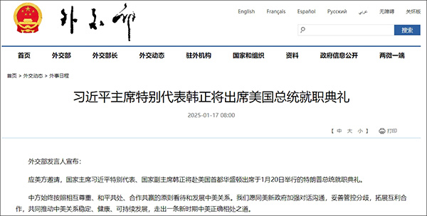 據外交部網站1月17日消息,外交部發言人宣佈:應美方邀請,國家主席習近平特別代表、國家副主席韓正將赴美國首都華盛頓出席於1月20日舉行的特朗普總統就職典禮。