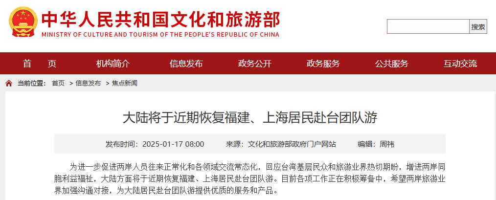 據文旅部網站17日消息,為進一步促進兩岸人員往來正常化和各領域交流常態化,回應台灣基層民眾和旅遊業界熱切期盼,增進兩岸同胞利益福祉,大陸方面將於近期恢復福建、上海居民赴台團隊遊。目前各項工作正在積極籌備中,希望兩岸旅遊業界加強溝通對接,為大陸居民赴台團隊遊提供優質的服務和產品。
